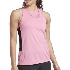 Stay cool on hill repeats in this Reebok Essentials Womens Running Vest Tank Top. It’s made of breathable, sweat-wicking fabric to help you stay cool and dry. A mesh panel in back keeps air circulating. The slim cut and racerback allow for easy movement.